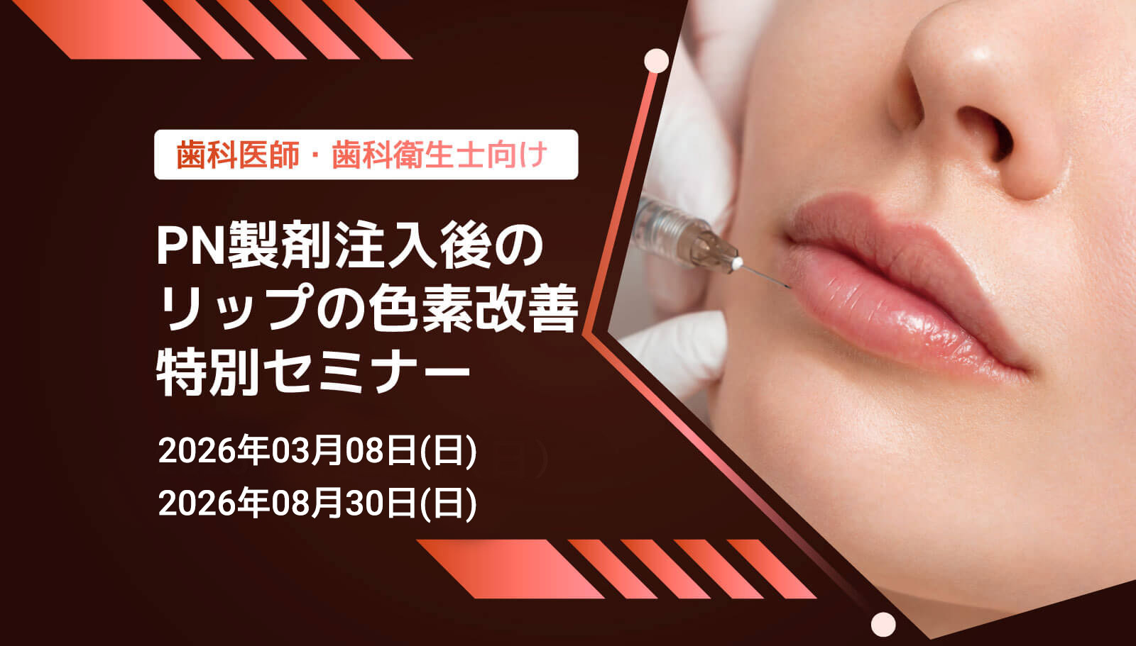 唇のくすみや色ムラにお悩みの患者さまに対し、より自然で健康的な印象へ導くためのアプローチとしてポリヌクレオチド製剤の注入とリップの色素改善技術を学べる1日講座を開催いたします。